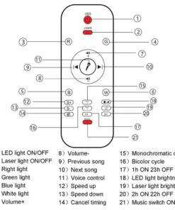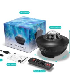 1 lampe de projection LED, 1 télécommande (batterie non incluse), 1 câble USB.